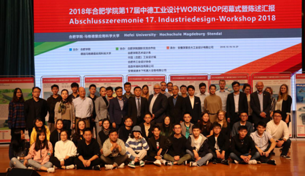 10月27日下午,第十七届中德工业设计WORKSHOP活动闭幕式暨项目陈述汇报会在我校图书馆报告厅举行。德国马格德堡应用科技大学提斯·克鲁格(Thies Krueger)教授、安徽深装合大工业设计有限公司总经理胡北南、中工经信投资发展有限公司执行总裁、合肥市工业设计协会执行副会长兼秘书长王正荣、鼎典创造体创始人陈向锋、溯洄设计事业合伙人兼设计研发部经理范宝成、劲旅环境科技有限公司技术总监郑磊、合肥市政协副主席、合肥民革主委、合肥学院艺术设计系主任谢海涛教授、合肥学院宣传部刘樟树部长、教务处葛春梅副处长及其他各职能部门负责人、艺术设计系杨大松教授、奥拉夫·瑞克(Olaf Rack)教授、产学研平台负责人苏文婷副教授及中德师生共同出席了此次活动。