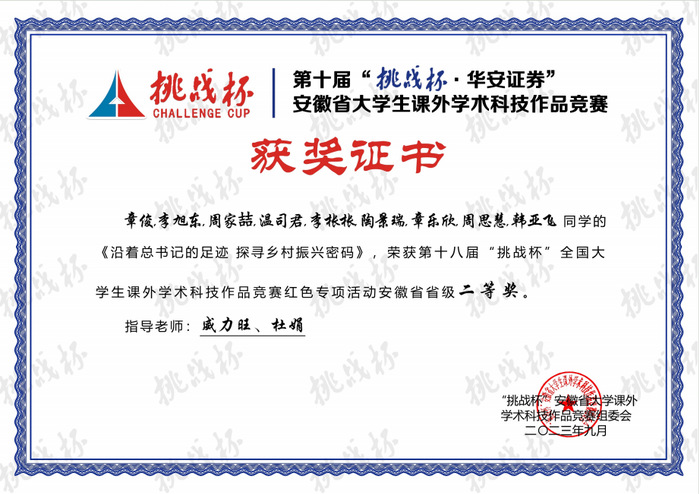 支部成立“寻迹知过去 奋斗向未来”暑期社会实践团队,在河北、福建、安徽重走习近平总书记的工作历程和考察足迹,再访总书记曾接见的大湾村村民陈泽申、大包干带头人严金昌和写信代表刘明华等人,开展了一系列以党史学习、红色教育、创新创业、疫情防控为主题的社会实践活动,调研总里程数达4500公里。支部成员在学习实践中追寻领袖足迹,感悟领袖思想伟力,最终获得安徽省暑期三下乡优秀实践团队和第18届挑战杯红色专项活动安徽省省级二等奖。