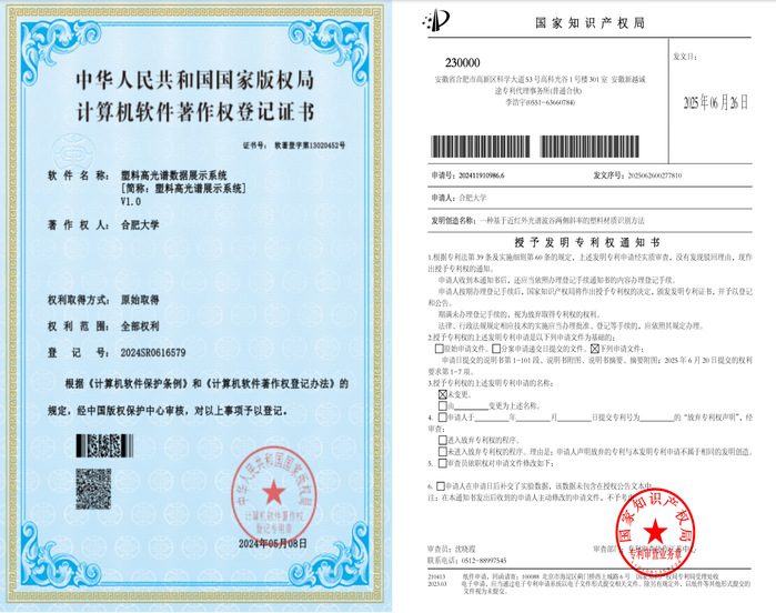 在光谱数据处理与特征波长选择研究领域,他先后发表EI检索学术论文2篇,除导师外第一作者。申请国家发明专利《一种基于近红外光谱波谷两侧斜率的塑料材质识别方法》已进入实审;授权软件著作权《塑料高光谱数据展示系统V1.0》(软件著作权号:2024SR0616579)和《杂交水稻稻种的光谱预处理及模型选择系统V1.0》(软件著作权号:2024SR1066700)。