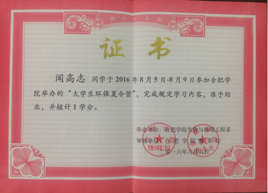 为营员颁发的结业证书 夏令营虽然时间短暂,但参与其中的大学生们纷纷表示收获不少。在短短的相聚中大家既收获了对于环境工程专业的进一步了解,体验了跨界合作学习的喜悦,也收获了同学之间美好的友谊。在此,也感谢为夏令营活动的开展付出辛勤劳动的有关老师和工作人员以及志愿者们!“合肥学院环保夏令营”,明年将继续举办! 安徽省应用型本科高校联盟秘书处 合肥学院生物与环境工程系 合肥学院研究生处 |
