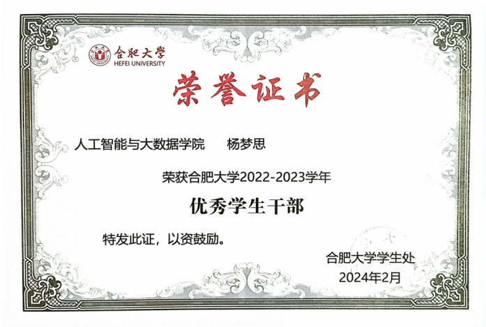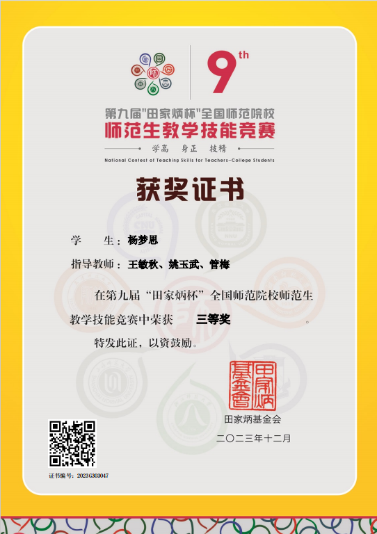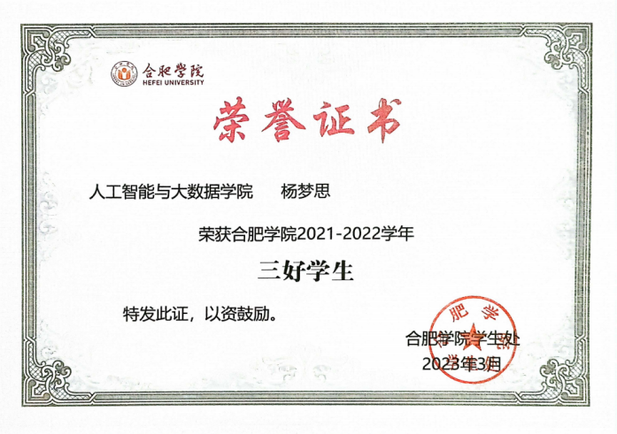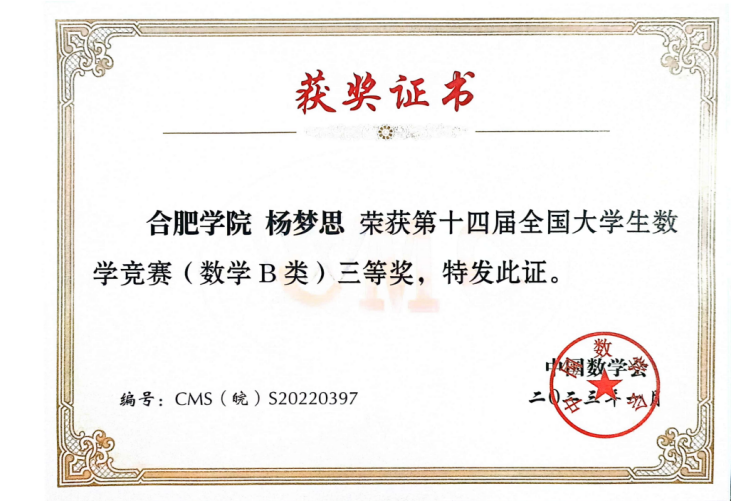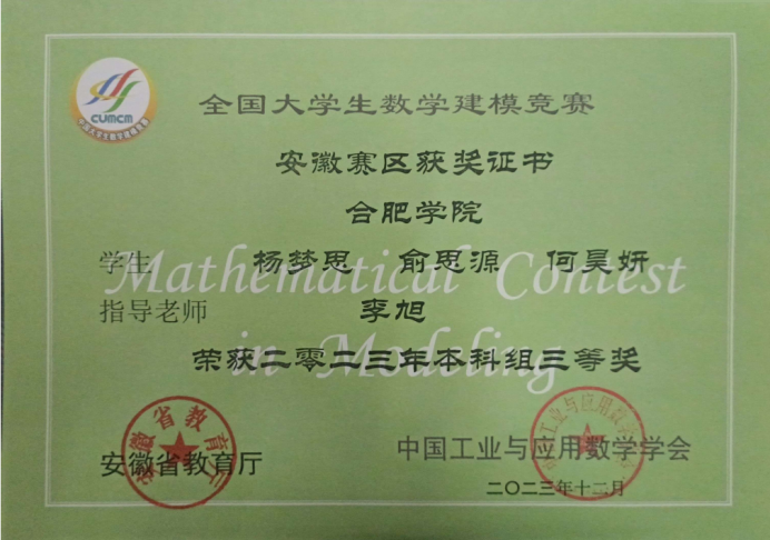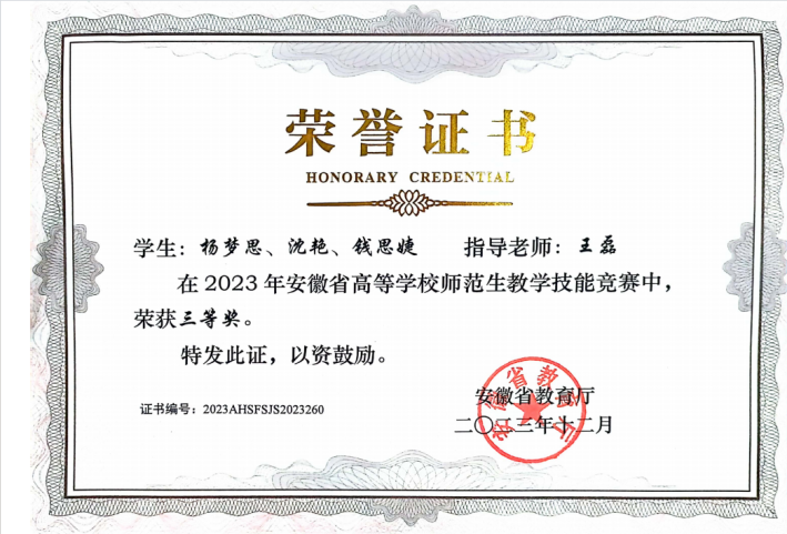 “自古圣贤之言学也,咸以躬行实践为先,识见言论次之。”优异的成绩不是终点,而是探索知识广度与深度的起点,实践环节更是检验知识的熔炉,各类学科竞赛便是杨梦思探索的第一步。在数学竞赛中巩固专业知识,了解细分的研究方向,在建模竞赛中锻炼合作意识与解决问题的能力,学会尊重和包容他人的不同意见,在师范生技能竞赛中提升授课水平,积累教学经验。她获得了第九届“田家炳杯”全国师范院校师范生教学技能竞赛三等奖,安徽省高等学校师范生教学技能竞赛三等奖,全国大学生数学建模竞赛安徽赛区本科组三等奖2023年安徽省大学生市场调查与分析大赛本科组二等奖,校级奖项数项。在合肥一中实习期间担任实习老师,全方位配合指导老师,迅速上手各项工作,深入研究教材内容,依据自己的知识体系,针对教学目标的确定、重难点的把握积极出谋划策,为指导老师提供有价值的参考意见,运用丰富的知识,结合生动有趣的案例,把复杂的知识简单化,让学生轻松理解。指导老师对其工作态度和教学能力十分赞赏,展现其良好的专业素养和潜力。