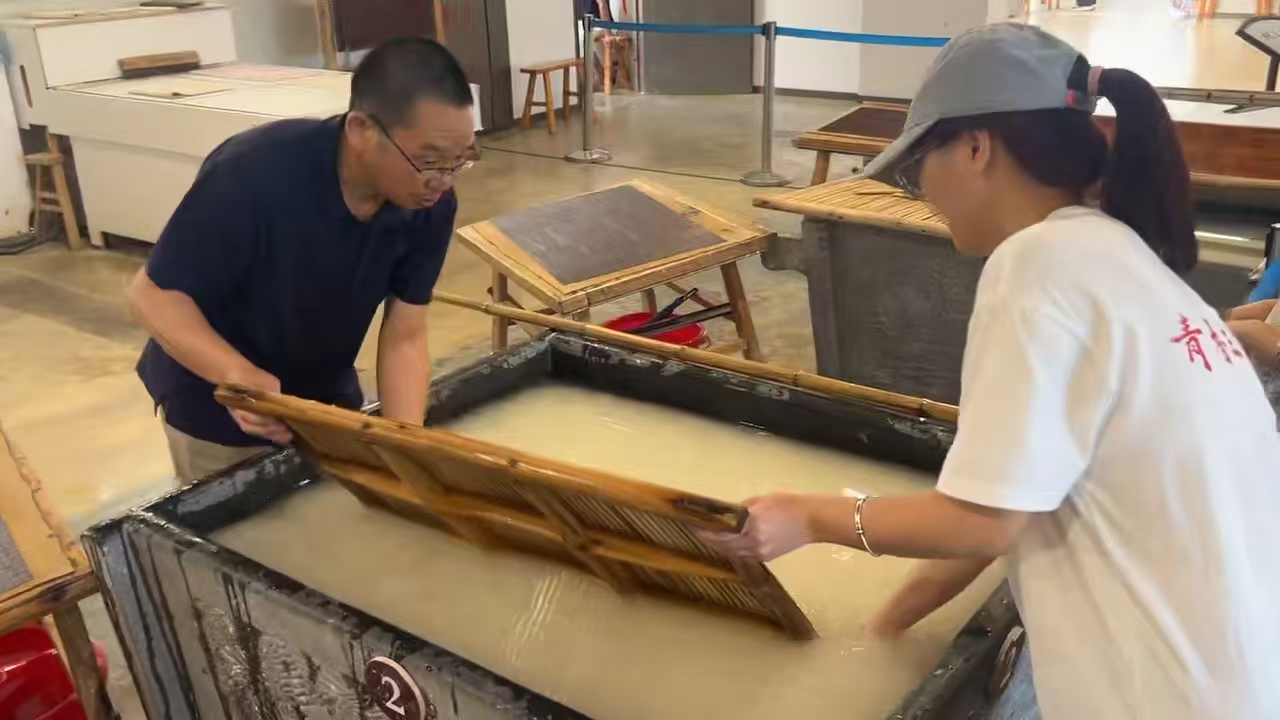 而在古法造纸体验区,团队成员们切实的看到匠人们是如何将一张宣纸制成。在“捞纸”技艺展区时,成员们看到匠人们手持竹帘浸入纸浆池,轻轻晃动、均匀捞起,再经压水、揭纸等环节,一张薄如蝉翼的湿纸坯逐渐成形,不禁感叹宣纸这项非遗文化的魅力与技艺的精细。此外,团队还参观了宣纸晒纸的方式。数张湿纸整齐排列在木架上,阳光透过纸张投射出斑驳光影,匠人手持长杆翻纸、调整角度,确保纸张均匀干燥。
