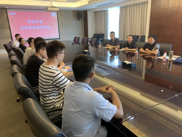 为进一步提升我院人才培养质量,增强“产学研”深度融合效果,加快学院产教基地建设进程,7月22日上午,先进制造工程学院党委书记杜娟、党委副书记李秀娟、就业联络员张傲、辅导员威力旺一行来到得力集团考察交流,受到了得力集团校招负责人邵莎莎等人的热情接待。