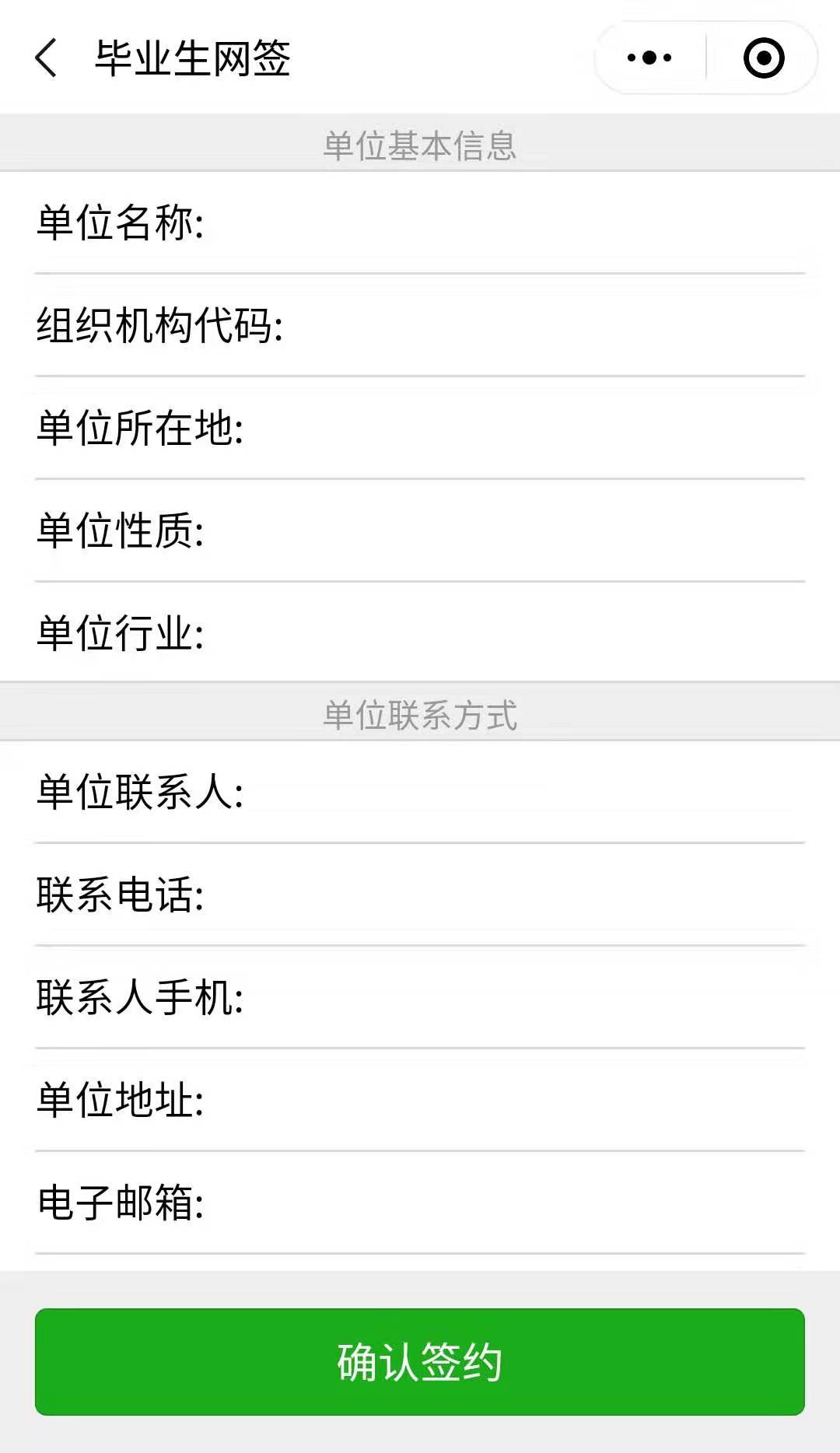 第二步、用人单位打开微信,使用扫一扫功能,扫码后,会出现填写签约信息页面;用人单位首先验证毕业生信息,确认下一步后,填写本单位基本信息和联系方式,并选择签约毕业生的工作岗位,然后点击“确认签约”后提交。
