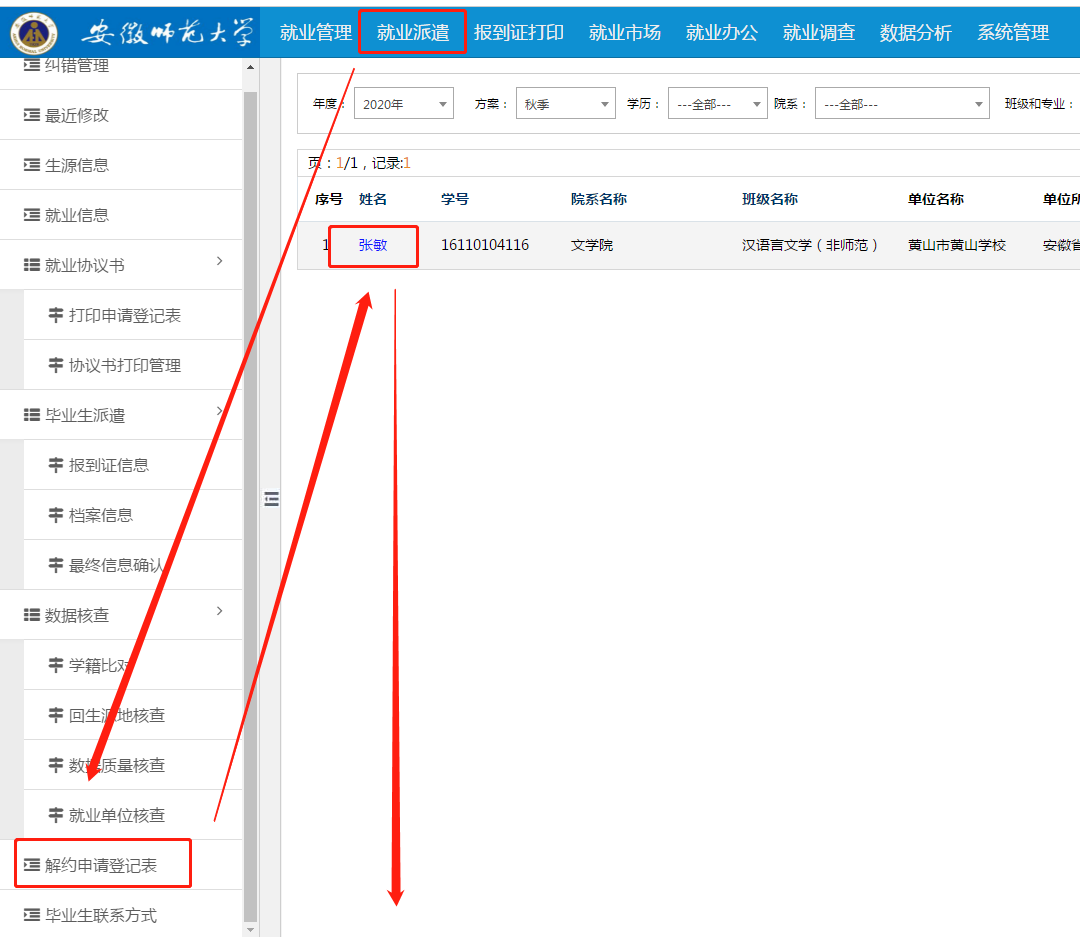 第二步、辅导员进入系统,点击上方“就业派遣”,再点击左下角“解约申请登记表”,点击申请学生姓名,进入审核页,点击“同意毁约”或“不同意毁约”即可。