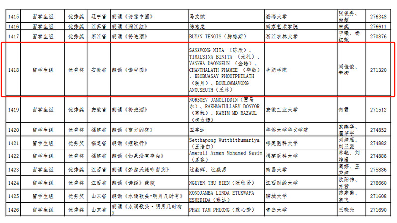 近日,中华经典诵写讲大赛执委会公布第五届中华经典诵写讲大赛“诵读中国”经典诵读大赛获奖名单,我校留学生喜获佳绩。由苏敏(AVANNALATH SOUDALATH)同学个人诵读的作品《妈妈,稻子熟了》(指导老师:胡双露、周冉)荣获全国三等奖;由陈欣(SANAVONG NITA)、尤礼(TIMALSINA BINITA)、金皓(VANNHA DAONGEUN)、李敏(CHANTHALATH PHAMEE)、映月(KEOBUASAY PHOUTPHILATH)、王林(BOULOMMAVONG ANOUSEUTH)等六位同学共同诵读的作品《读中国》(指导老师:周佳俊、章衡)荣获全国优秀奖