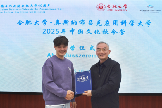 Recently, the 2025 Chinese Cultural Autumn Camp co-hosted by Hefei University(HFU) and Osnabruck University of Applied Sciences(OUA) came to a successful conclusion. Ren Yong, President of HFU and Wu Pingchuan, Chair of the University Council, attended the opening and closing ceremonies respectively.