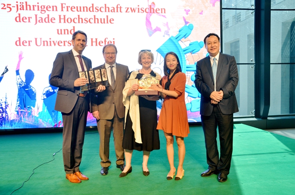 On May 26, an economic delegation from Lower Saxony, Germany, led by Olaf Lies, minister of the Economic, Employment and Energy Department of the State, visited Hefei University to attend the opening ceremony of Sino-German “Logistics 4.0” laboratory and the 25th anniversary of the establishment of partnerships between Jade University of Applied Sciences and Hefei University. Attendees of the events above include Zhang Lifang, Deputy Director of the Foreign Affairs Office of Anhui Province, Wu Chunmei, Deputy Mayor of Hefei Municipality, and Ding Yuhong, Director of the Foreign Affairs Office of the Department of Education of Anhui Province.