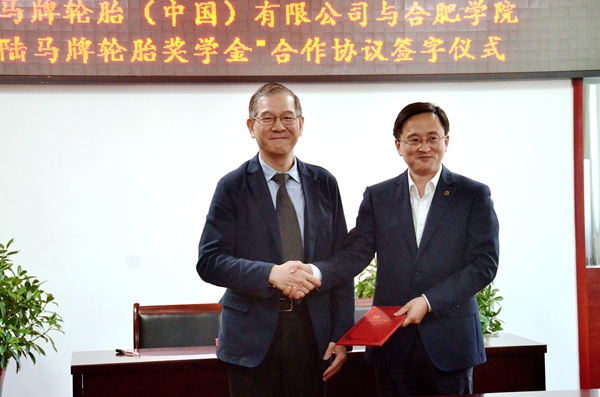 4月9日,我校与大陆马牌轮胎(中国)有限公司在行政楼九楼东会议室签订“大陆马牌轮胎奖学金”合作协议。大陆马牌轮胎合肥工厂总经理王小骥,大陆公司人力资源总监孙怡,合肥学院党委副书记、校长王其东出席签约仪式。