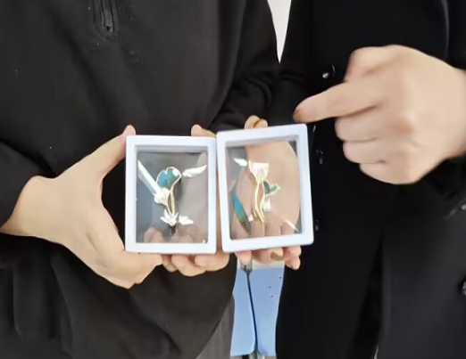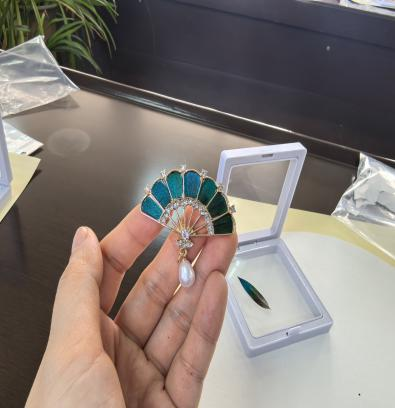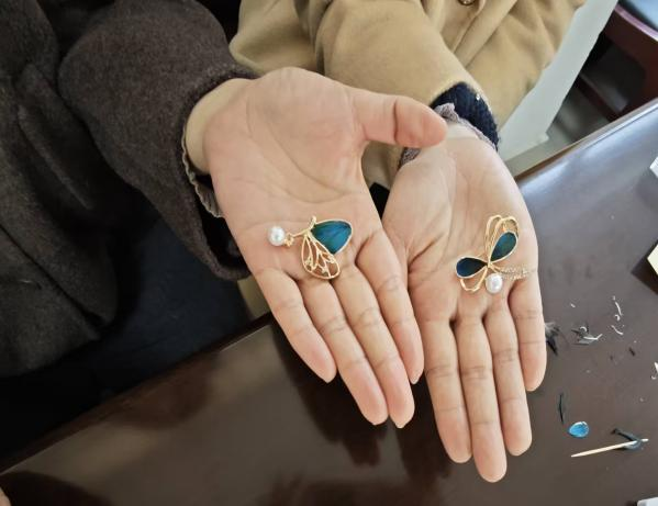 活动开始后,讲师现场授课,简单介绍了点翠工艺的历史渊源、文化内涵以及制作技艺。点翠工艺是中国传统金银首饰制作中的一种独特技艺,以翠鸟羽毛点缀金银饰品,呈现出绚丽夺目的色彩。在讲师的指导下,女教师们纷纷化身“巧手匠人”,学习如何将孔雀羽毛巧妙地粘贴在胸针底座上,制作出独一无二的精美胸针。