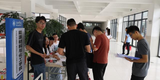 为做好2019级能源材料与化工学院研究生的迎新工作,确保新生顺利报到,院成立研究生迎新工作组,提前准备,对迎新工作的各个环节进行了细致周密的安排部署。按照迎新方案,提前通知新生准备研究生入学所需要的毕业证书以及学历验证报告等相关材料。早上八点不到,第一名来自南京的学生就来到生化楼报到,在报到台前有序交齐升学各项材料,领取新生入学报告单和入住单,然后到分配的宿舍报到入住。能源材料与化工学院院长董强、副院长胡坤宏上午前往报道地点,查看报道情况,对志愿者们的工作给予肯定,对报考我校的研究生们表示了欢迎。
