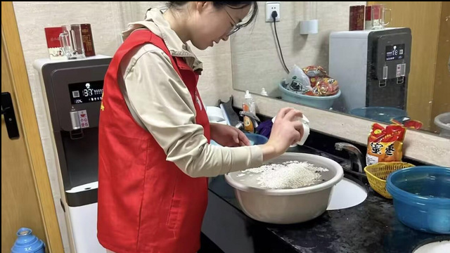 当天清晨,志愿者们一到现场便立刻投入到各项筹备工作中,有的协助布置场地,有的准备活动所需的材料和工具。他们热情洋溢地投入到包粽子的各项准备工作中,包括清洗粽叶和淘洗糯米,细心地将一片片翠绿的粽叶洗净,确保每一片叶子都干净无杂质,散发出自然的清香。糯米经过反复淘洗,变得晶莹剔透,粒粒饱满。志愿者们分工明确,有的负责浸泡糯米;有的则专注于修剪粽叶,使其形状整齐,便于包裹。在忙碌而有序的氛围中,大家脸上洋溢着笑容,彼此间不时交流着包粽子的心得与技巧,整个场面温馨而和谐。
