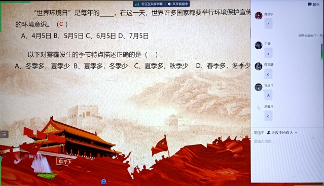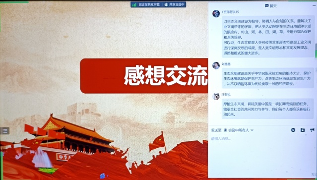 活动开始时,支部书记王多慈带领支部党员共同学习了习近平生态文明思想,以及安徽省第十一次代表大会会议精神。王老师指出,青年党员应肩负起全面推进美丽中国建设、加快推进人与自然和谐共生的现代化的时代责任。接着,支部党员在群聊中积极发表感想,通过相互交流学习到了如何更好地将生态文明建设付诸实践,坚定自身推动生态文明建设的使命感和责任感。在活动的最后,支部党员周天艺带领大家进行了“生态知识我知道”的抢答小游戏,大家都踊跃参与其中,并表示这样的趣味小游戏让自己对于如何更好为生态文明建设贡献青年力量有了进一步的帮助。