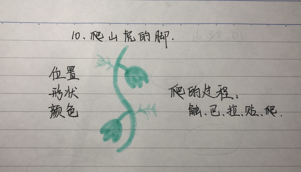师小结:原来爬山虎可不像动物那样几只脚交替着爬,而是长一只脚巴住墙,再爬就必须再长一只脚,再巴住墙。一直往上长,必须不断长出新脚。所以,叶圣陶爷爷才说爬山虎是“一脚一脚”往上爬。