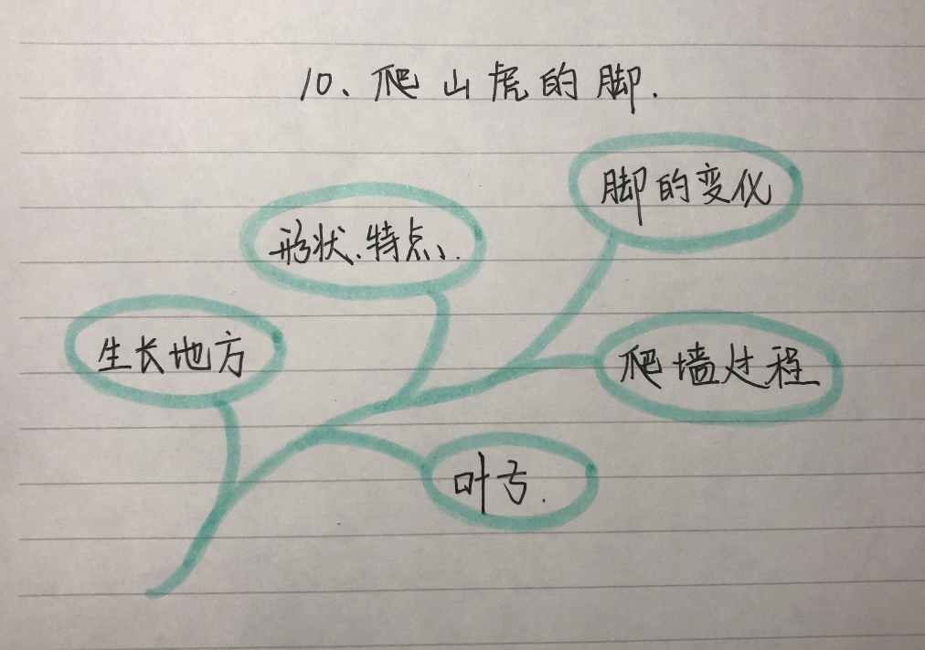 (4)师小结:我们根据这幅图画,学会抓住关键词句进行提炼,很快就知道文章写了什么。作者按顺序先写了爬山虎生长的位置,再写叶子,最后写爬山虎的脚。