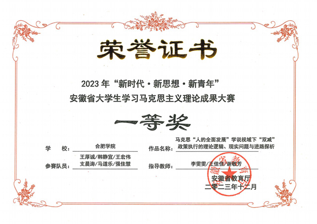校学子2023“新时代·新思想·新青年”安徽省大学生学习马克思主义理论成果大赛中获得一等奖
