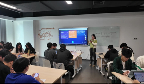 外研社“教学之星”大赛以多语种、多层次、多模式为特色,在全国高校外语教育领域广受认可,被连续列入中国高等教育学会“全国普通高校教师教学发展指数”,今年大赛的主题为“外语教材的有效使用:聚力创新,分类卓越”。由于时间紧任务重,朱越老师巧妙地将比赛要求与2024级双元制大陆班日常教学相结合,创新性地选择了学生感兴趣的Fit und gesund”(身体健康、精力充沛这一单元作为教学内容,既保证了教学的连贯性,又满足了大赛的参赛需求。课堂教学展示环节的教学内容从医患沟通的真实情境出发,通过精心设计且环环相扣的教学环节,包括课堂预学环节的写作练习、课堂中的口语交际与智能体对话以及课外拓展训练,朱越老师不仅激发了学生的参与热情,还引导学生掌握医患沟通交流技巧,树立自发关心爱护他人的意识,在别人遇到意外情况时表达关切、寻找解决方案并给予帮助。