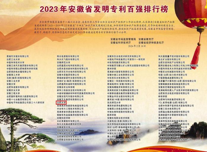 近日,省市场监督管理局、省教育厅、省科技厅、省经信厅联合发布了《2023年安徽省发明专利百强排行榜》。我校继2021年排名第37位、2022年排名第34位后,2023年升至第32位,连续九年进入安徽省发明专利百强榜。